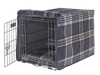 Crate Cover – Greystone Tartan Plaid in Luxury Upholstery Fabric with Elegant Piping, Machine Washable Roll-Up Front Panel for Stylish Dog Crate Privacy